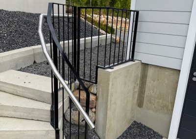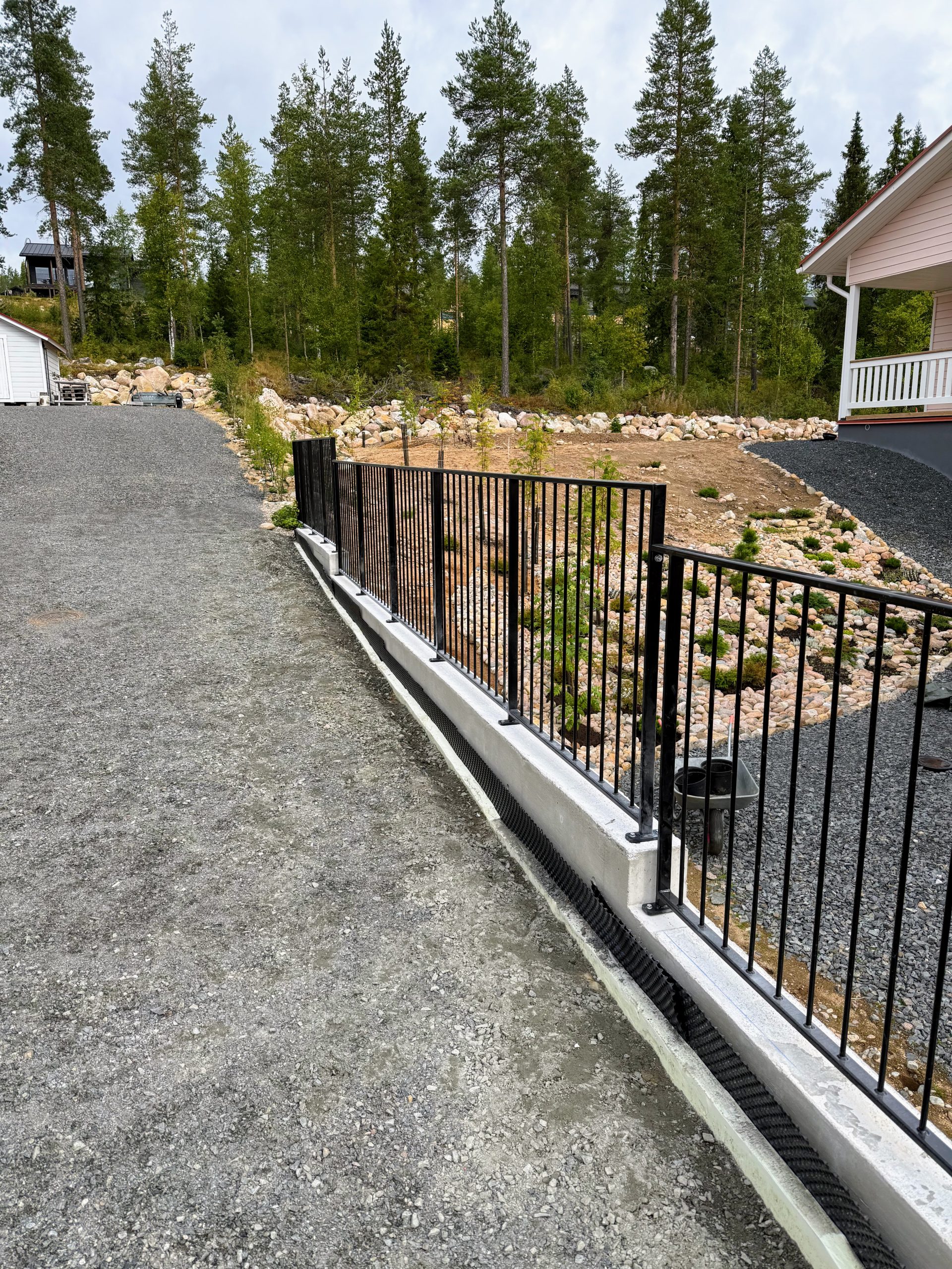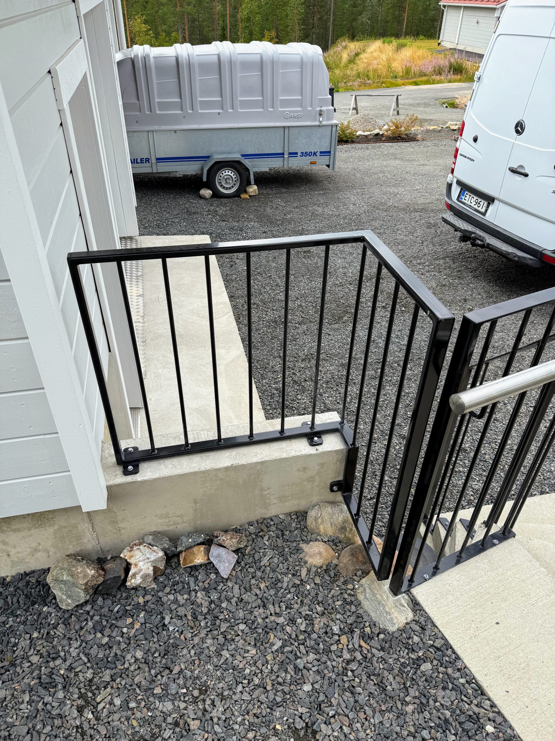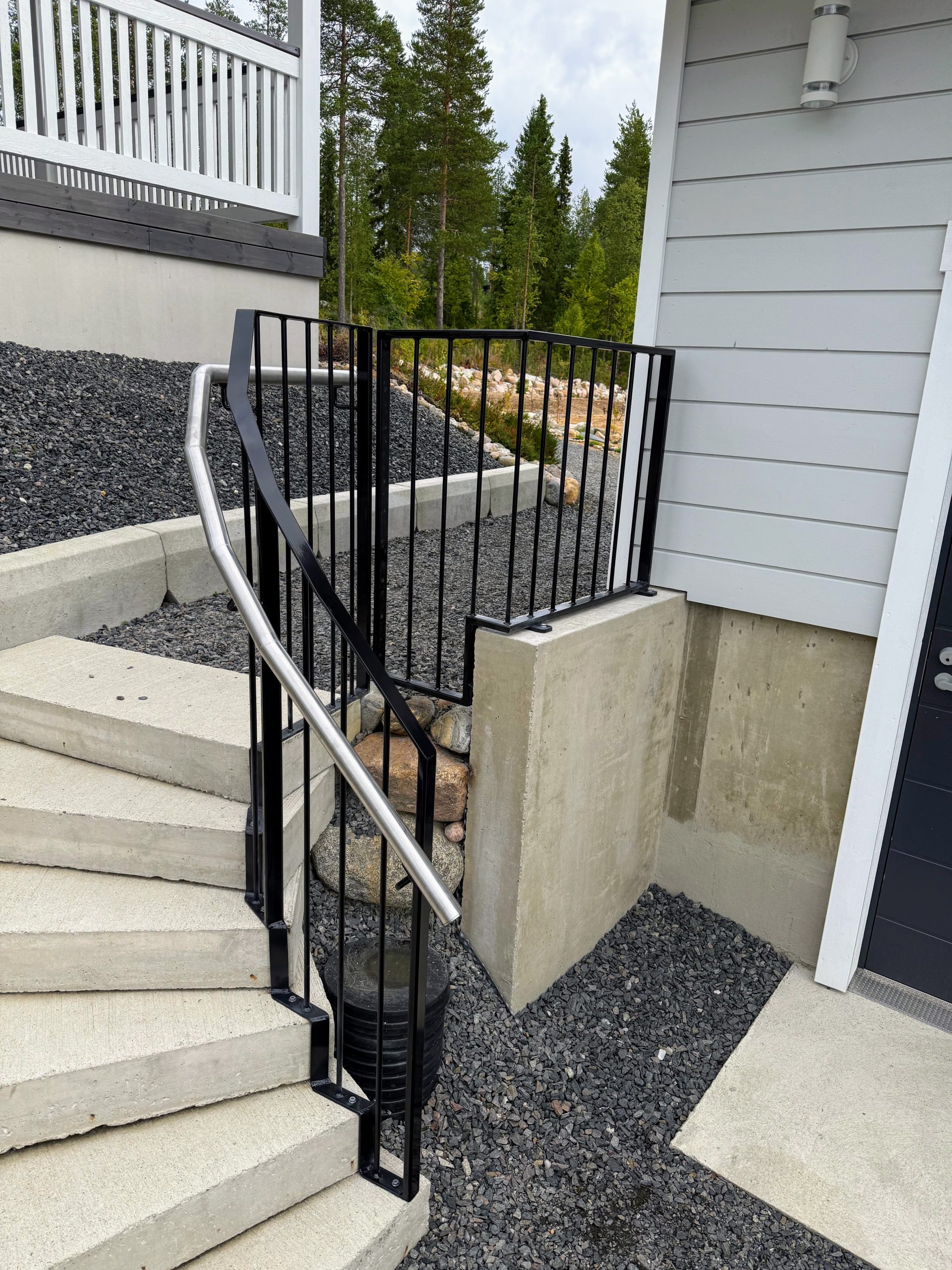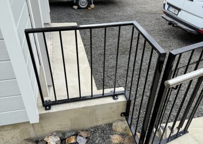 Omakotitaloon tukimuurinkaiteet ja portaidenkaiteet asennettuna.